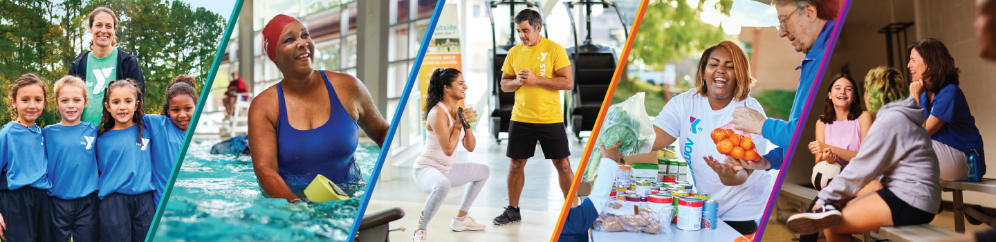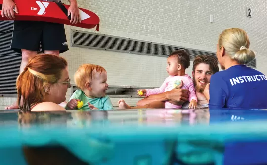 A mother and her toddler and child swim in a YMCA outdoor pool supervised by a YMCA Lifeguard
